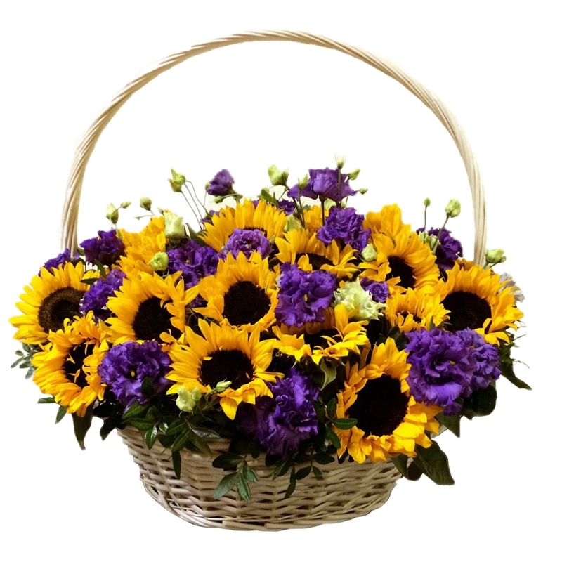 Букет состоит из 21 подсолнух, 11 веток эустомы, зелень, корзина, оазис.