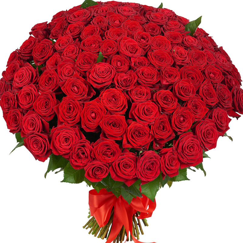 Букет состоит из 101 красная роза, прозрачная упаковка, красная лента.